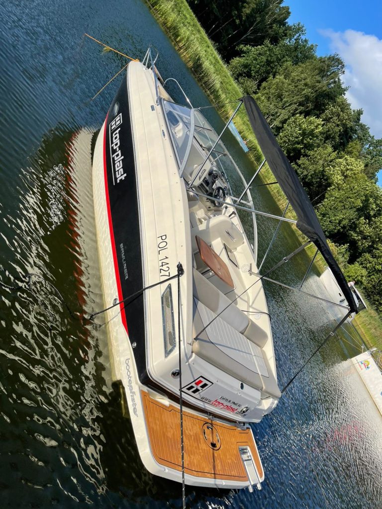 Poza standardowym wyposażeniem, do Państwa dyspozycji oddajemy lodówkę sprężarkową. W kokpicie znajduje się sterówka i część wypoczynkowa, która osłonięta jest stałym zadaszeniem, które chroni od słońca, a w ulewne dni dzięki specjalnym roletom umożliwia komfortowe pływanie. Sternik ma do dyspozycji echosondę z GPS mazurskich jezior, manetkę silnika, panel steru strumieniowego, panel od świateł, panel od radia. Tylni trap jednostki jest bardzo obszerny i zapewnia pełnym komfort przy kąpielach w jeziorze,